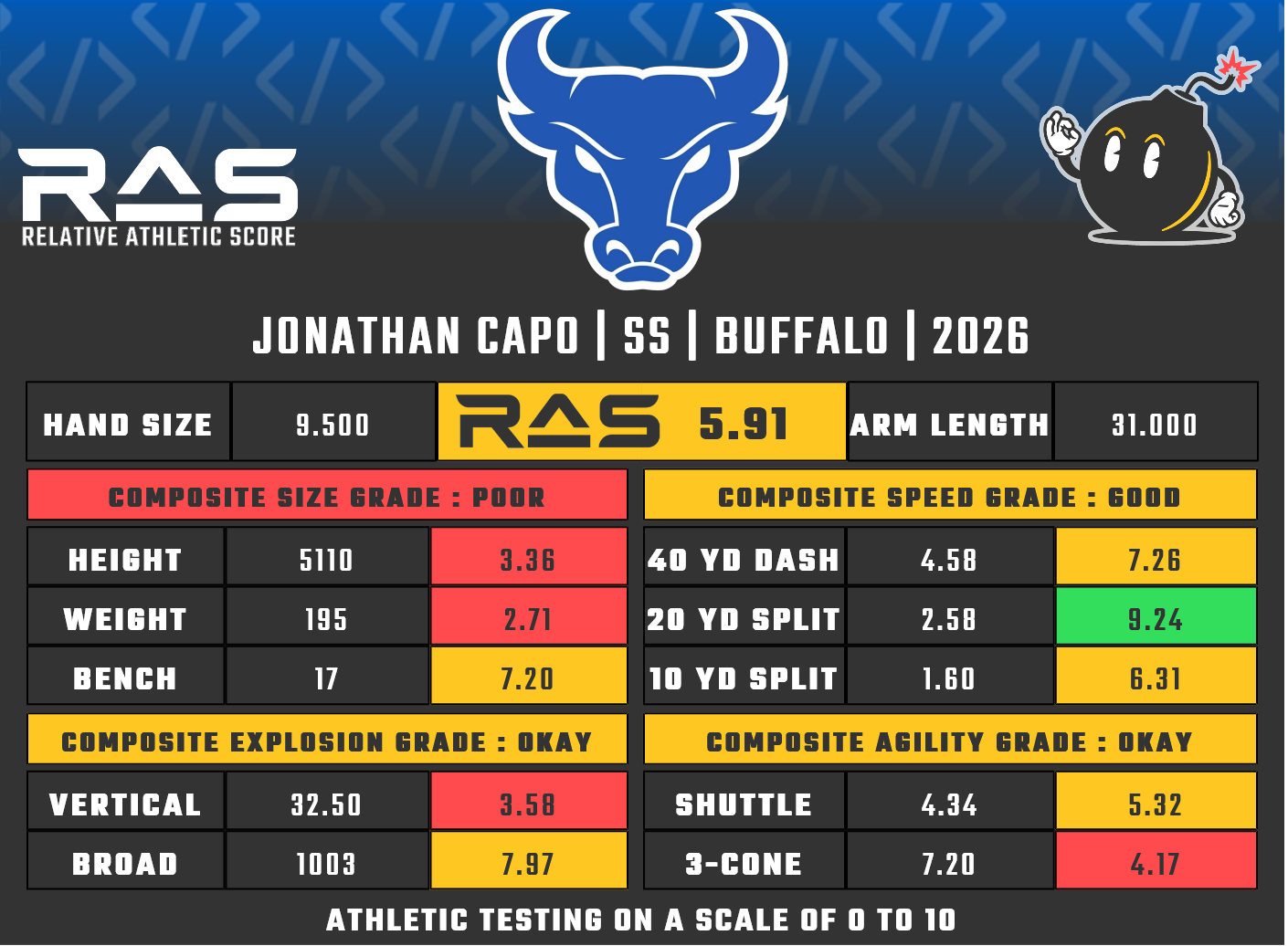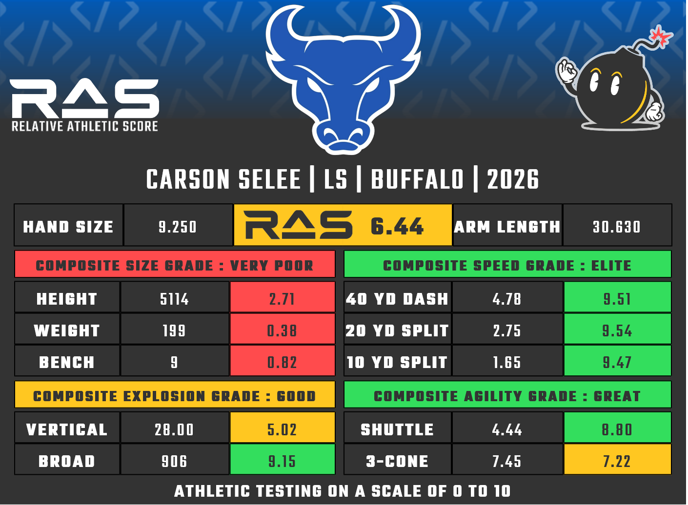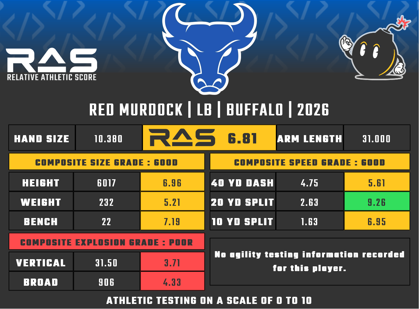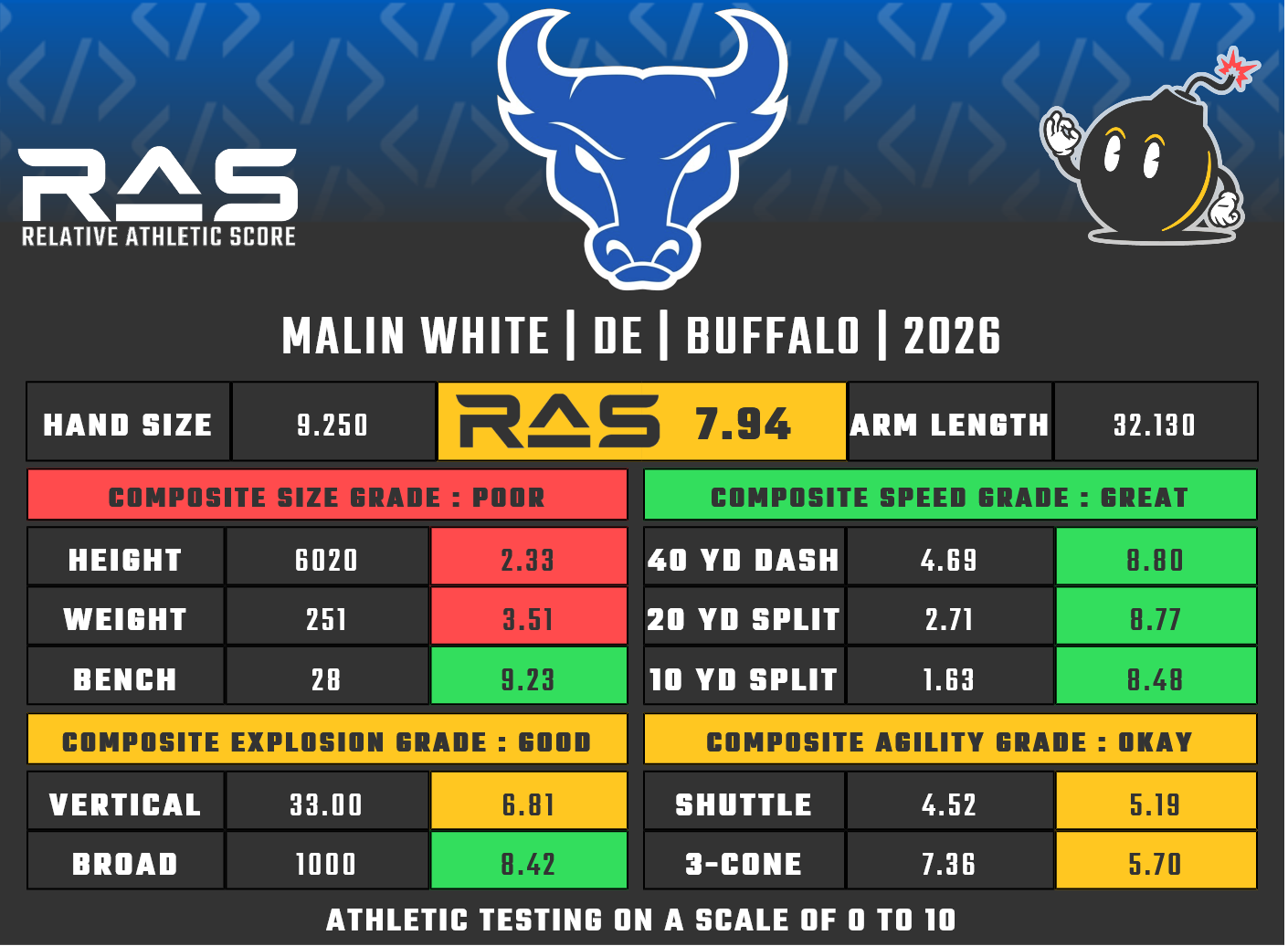 For our reports, we’ve pulled raw numbers from both Draft Scout and RAS.football to populate RAS score cards. These cards are used with express written permission of RAS’ creator Kent Lee Platte.
